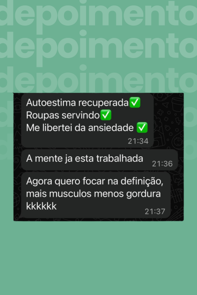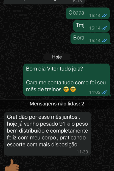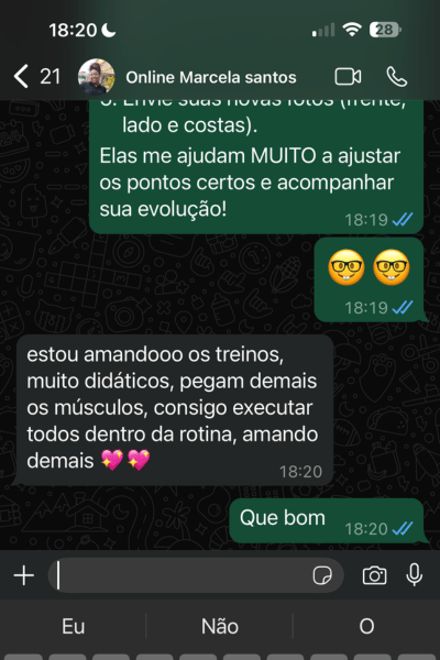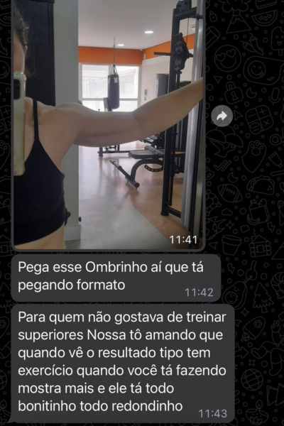 Dúvida surgiu? É só mandar mensagem. Sem esperar dias por resposta, sem ser ignorada. Você tem acesso direto ao seu personal toda semana para ajustes, motivação e acompanhamento real.